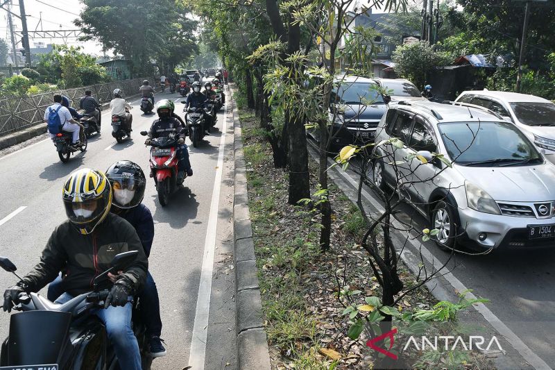 Sejumlah motor yang akan menuju Jakarta melawan arus lalu lintas untuk menghindari kemacetan di Jalan I Gusti Ngurah Rai, Bekasi, Jawa Barat, Senin (19/9/2022). Pemerintah Provinsi DKI Jakarta merancang uji publik yang melibatkan instansi pemerintah pusat, daerah dan asosiasi terkait usulan pengaturan jam kerja, untuk menekan kemacetan jalanan yang saat ini telah mencapai 48 persen. ANTARA FOTO/ Fakhri Hermansyah/aww.