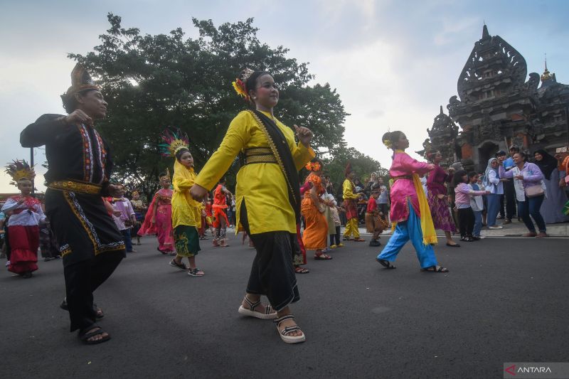 Sejumlah penari menampilkan Tari Maumere asal Nusa Tenggara Timur dalam acara Festival Pulang Kampung Lebaran 2024 di Taman Mini Indonesia Indah (TMII), Jakarta, Kamis (11/4/2024). Pengelola TMII menyebutkan sekitar 20.000 wisatawan mengunjungi obyek wisata tersebut pada hari kedua Lebaran 2024 (data terakhir pukul 15.00 WIB). ANTARA FOTO/Aditya Pradana Putra/foc.