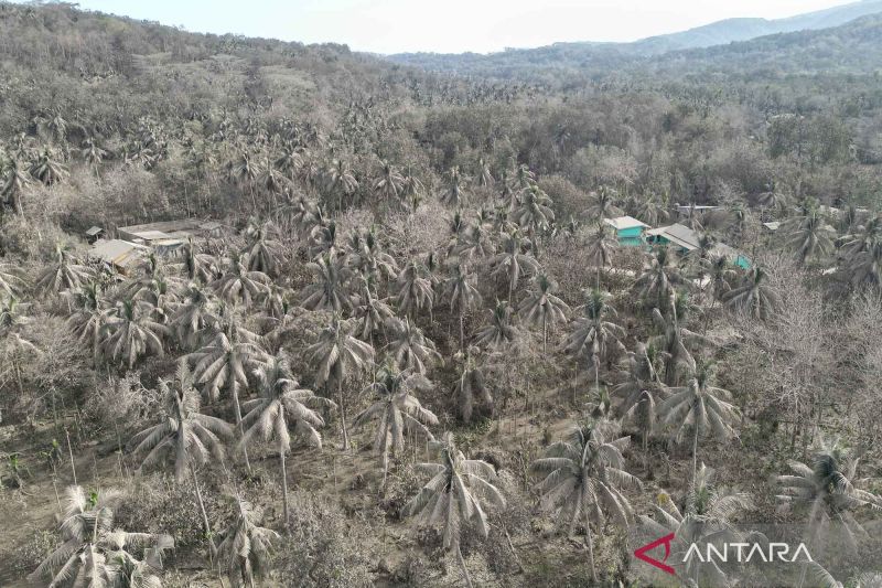 Debu vulkanis dari erupsi Gunung Lewotobi Laki-laki menutupi atap bangunan-bangunan dan pepohonan di Desa Boru, Wulanggitang, Kabupaten Flores Timur, Nusa Tenggara Timur, Senin (11/11/2024). Berdasarkan data Badan Nasional Pencarian dan Pertolongan (Basarnas) hingga Senin (11/11) siang, pengungsi korban erupsi Gunung Lewotobi Laki-Laki di Flores Timur, Nusa Tenggara Timur (NTT), mencapai 12.200 dari sejumlah desa di zona bahaya radius sembilan kilometer dari pusat erupsi. ANTARA FOTO/Aditya Pradana Putra/YU