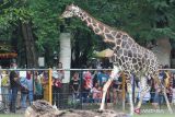 Sejumlah warga menyaksikan Jerapah saat berkunjung di Kebun Binatang Surabaya, Surabaya, Jawa Timur, Rabu (1/1/2025). Perusahaan Daerah (PD) Taman Satwa Kebun Binatang Surabaya mencatat pada Rabu (1/1) pukul 11.00 WIB sebanyak 22.000 orang berkunjung di Kebun Binatang Surabaya pada libur tahun baru 2025. ANTARA FOTO/Didik Suhartono/aww.