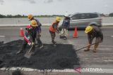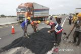 Pekerja melakukan pengaspalan jaan berlubang di ruas Tol Pemalang-Batang, Kabupaten Pemalang, Jawa Tengah, Jumat (21/3/2025). PT Pemalang Batang Tol Road mempercepat perbaikan jalan berlubang di ruas tol tersebut dengan pengaspalan sepanjang 23 kilometer dan perbaikan jalan beton sepanjang 16 kilometer untuk memberikan kenyamanan bagi pengendara saat arus mudik dan balik Lebaran 2025. ANTARA FOTO/Harviyan Perdana Putra/tom.
