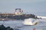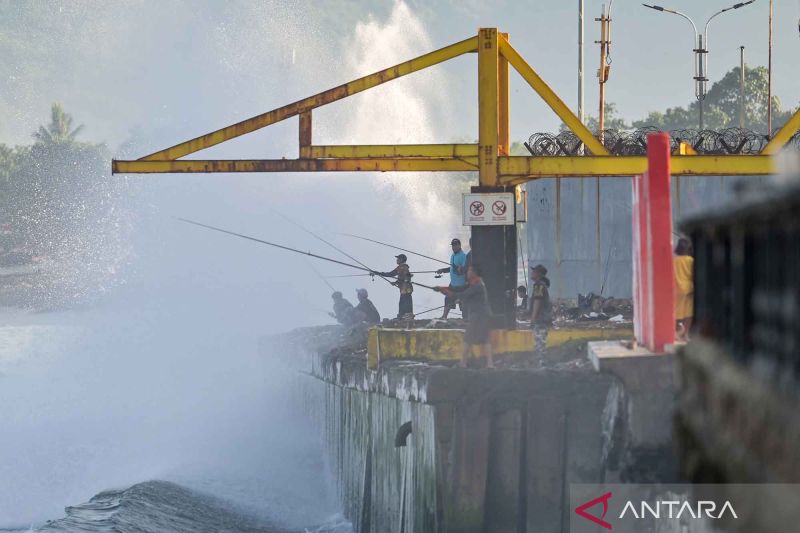 Sejumlah warga memancing di pinggiran pantai saat terjadi gelombang tinggi di Pantai Ampenan, Mataram, NTB, Minggu (20/4/2025). Badan Meteorologi, Klimatologi dan Geofisika (BMKG) Stasiun Meteorologi Zainuddin Abdul Madjid NTB mengeluarkan peringatan dini terkait cuaca ekstrem yang berpotensi masih terjadi hingga 23 April 2025 mendatang dan meminta masyarakat untuk mewaspadai terjadinya potensi gelombang tinggi wilayah NTB, di antaranya Selat Lombok Bagian Utara dan selatan, Selat Alas bagian selatan serta Samudra Hindia di selatan NTB.ANTARA FOTO/Ahmad Subaidi/YU