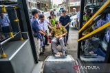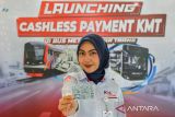 Petugas menunjukkan kartu multi trip (KMT) usai peluncuran KMT di Stasiun Bandung, Jawa Barat, Kamis (19/6/2025). KAI Commuter Indonesia bekerja sama dengan Dinas Perhubungan Jawa Barat meluncurkan kartu multi trip yang dapat digunakan untuk transaksi pembayaran tiket Bus Metro Jabar Trans di Stasiun Bandung guna mempermudah penumpang untuk melakukan pembayaran. ANTARA FOTO/Raisan Al Farisi/rwa.