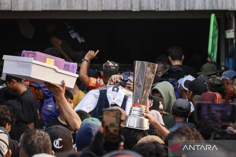Massa mengeluarkan barang milik anggota DPR Ahmad Sahroni dari dalam rumahnya di kawasan Tanjung Priok, Jakarta, Sabtu (30/8/2025). ANTARA FOTO/Dhemas Reviyanto/agr