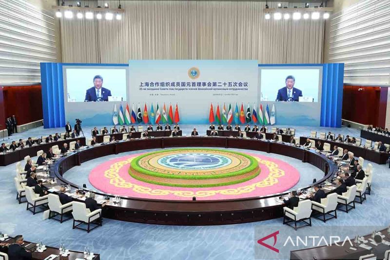 Presiden China Xi Jinping memimpin Pertemuan ke-25 Dewan Kepala Negara Organisasi Kerja Sama Shanghai (SCO) dan menyampaikan pidato berjudul Tetap Setia pada Pendirian SCO dan Menuju Masa Depan yang Lebih Baik di Tianjin, China bagian utara, Senin (1/9/2025). ANTARA FOTO/Xinhua/Ding Haitao/rwa.
