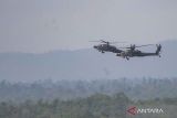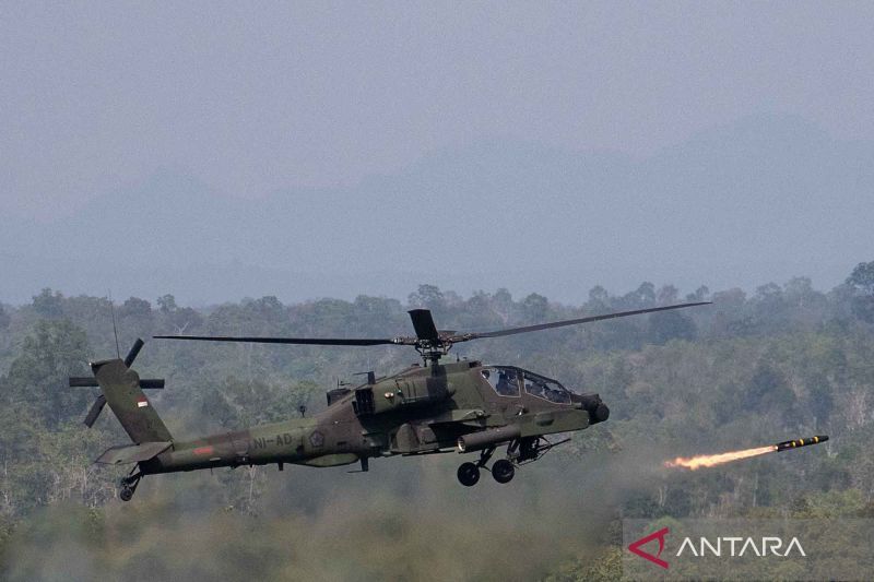 Helikopter AH-64E Apache milik TNI AD melakukan penembakan saat puncak Latihan Gabungan Bersama (Latgabma) Super Garuda Shield 2025 di Pusat Latihan Tempur (Puslatpur) di Martapura, Ogan Komering Ulu (OKU) Timur, Sumatera Selatan, Rabu (3/9/2025). Pelaksanaan puncak latihan The Combined Arm Live Fire Exercise (Calfex) melibatkan alutsista yang digunakan yakni dua pesawat F-16 milik TNI AU, dua helikopter AH-64 Apache milik TNI AD, roket Astros milik TNI AD, Vampire RM-70 Grade milik TNI AL serta alutsista milik tentara Amerika (US Army) yaitu empat helikopter AH-47 Apache dan roket Himars. ANTARA FOTO/Nova Wahyudi/YU