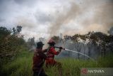 Helikopter MI-8Mtv milik Badan Nasional Penanggulangan Bencana (BNPB) memadamkan kebakaran lahan dari udara (water boombing) yang terjadi di sisi gerbang tol rambutan Jalan Tol Trans Sumatera (JTTS) ruas Palembang - Indralaya (Palindra) di Desa Rambutan, Ogan Ilir (OI), Sumatera Selatan, Minggu (21/9/2025). Kebakaran lahan yang terjadi sejak Sabtu (20/9) tersebut berhasil dipadamkan oleh petugas gabungan dari Manggala Agni Daops Banyuasin, Manggala Agni Daops Lahat, Manggala Agni Daops OKI, BPBD Kab Ogan Ilir (OI) dan dibantu dua helikopter water boombing milik BNPB. ANTARA FOTO/Nova Wahyudi/agr