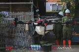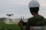 Operator dari Maxxi Tani menerbangkan pesawat tanpa awak atau drone untuk menyemprotkan pestisida di area persawahan Desa Tanara, Kecamatan Tanara, Kabupaten Serang, Banten, Rabu (1/10/2025). Kelompok tani Sukamaju, Desa Tanara mulai menggunakan teknologi drone pertanian untuk penyemprotan pestisida sebab dinilai lebih efektif dan efisien jika dibandingkan cara konvensional karena hanya membutuhkan waktu rata-rata 15 menit untuk satu hektare lahan dengan tarif Rp550 ribu-Rp600 ribu termasuk larutan pestisida per hektarenya. ANTARA FOTO/Angga Budhiyanto/rwa.