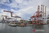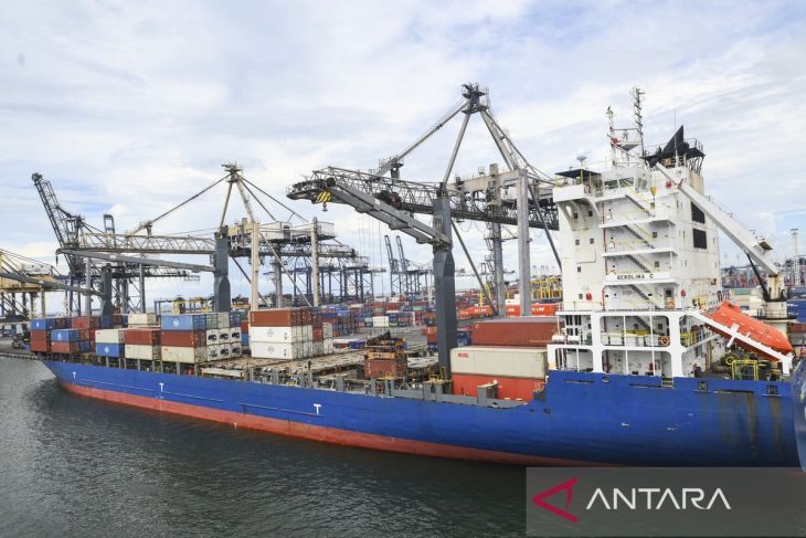 Suasana aktivitas bongkar muat peti kemas di Pelabuhan Tanjung Priok, Jakarta, Kamis (2/10/2025). Badan Pusat Statistik (BPS) menyebutkan Indonesia memperoleh surplus neraca perdagangan 64 bulan berturut-turut setelah pada Agustus 2025 berhasil mencatatkan surplus sebesar 5,49 miliar dolar AS. ANTARA FOTO/Hafidz Mubarak A/tom.