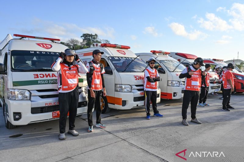 Tim medis berdiri di dekat mobil ambulance menjelang balapan MotoGP Indonesia 2025 di medical center Sirkuit Internasional Pertamina Mandalika, Lombok Tengah, Nusa Tenggara Barat, Jumat (3/10/2025). Sebanyak 140 tenaga medis yang terdiri dari dokter dan perawat profesional, 22 unit ambulans dan 2 helikopter diterjunkan untuk mendukung perhelatan MotoGP Indonesia 2025 di Sirkuit Mandalika.ANTARA FOTO/Ahmad Subaidi/nz