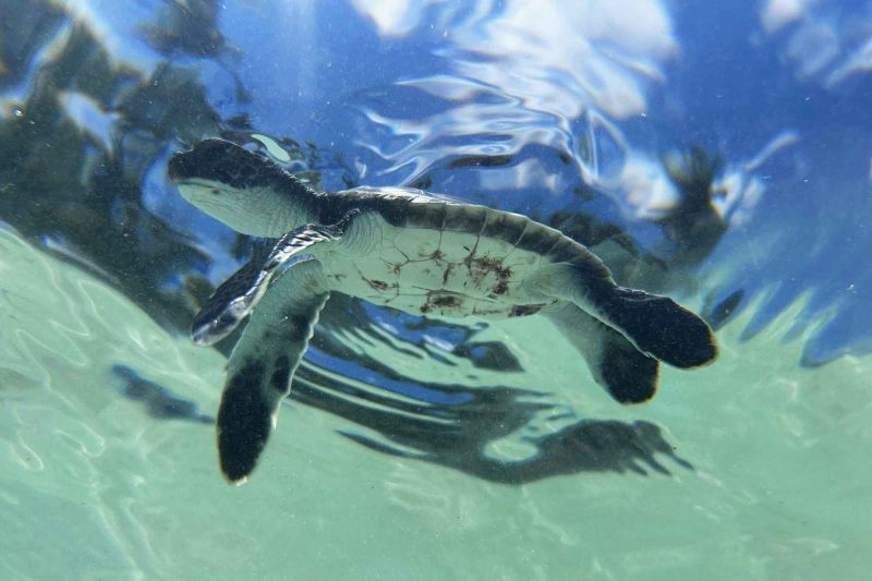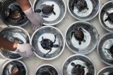 Tukik yang dilepaskan Balai Taman Nasional Wakatobi (BTNW) berenang di Pantai Wambuliga saat aksi konservasi transplantasi karang dan pelepasan tukik di Wakatobi, Sulawesi Tenggara, Sabtu (4/10/2025). Aksi konservasi tersebut bagian dari kegiatan Wakatobi Festival and Expo (Wave) 2025 bertujuan untuk menjaga kondisi dan kelestarian ekosistem terumbu karang, serta menanggulangi populasi penyu yang semakin menurun akibat perburuan dan degradasi lingkungan. ANTARA FOTO/Jojo/YU
