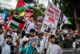 Pengunjuk rasa membawa poster saat aksi solidaritas bela Palestina di depan Kedutaan Besar Amerika Serikat, Jakarta, Selasa (7/10/2025). Aksi tersebut menuntut agar blokade Gaza dapat dibuka dan menghentikan aksi kekejian genosida oleh tentara Israel. ANTARA FOTO/Bayu Pratama S/nym.