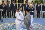 Presiden Prabowo Subianto (kanan) berjabat tangan dengan Gubernur Papua Mathius Fakhiri (kiri) disaksikaan Wakil Gubernur Aryoko Rumaropen (kedua kiri) saat acara pelantikan di Istana Negara, Jakarta, Rabu (8/10/2025). Presiden melantik Gubernur dan Wakil Gubernur Papua Mathius Fakhiri dan Aryoko Rumaropen untuk masa jabatan 2025-2030 berdasarkan Keputusan Presiden Nomor 108B Tahun 2025. ANTARA FOTO/Galih Pradipta/tom.