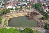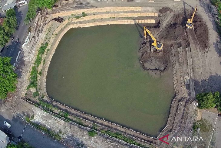 Foto udara alat berat mengeruk tanah untuk menyelesaikan pembangunan bozem di kawasan Ketintang Permai, Surabaya, Jawa Timur, Kamis (9/10/2025). Pemkot Surabaya membangun empat bozem baru di empat lokasi berbeda, yakni di Taman Kendangsari, Kebonsari Baru Selatan, Ketintang Permai dan Tengger Kandangan sebagai upaya untuk mengendalikan atau meminimalisir banjir di kawasan tersebut. ANTARA FOTO/Didik Suhartono/YU
