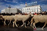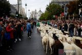 Ratusan domba berjalan di pusat kota Madrid saat Festival Migrasi Domba di Madrid, Spanyol, Minggu (19/10/2025). Festival yang telah berlangsung selama berabad-abad tersebut merupakaan sebagai bagian dari peringatan tradisi kuno para penggembala untuk memindahkan ternak dari padang rumput musim panas ke padang rumput musim dingin. ANTARA FOTO/REUTERS/Alejandro Martinez Velez/agr