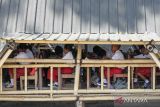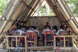 Sejumlah murid yang merupakan penyintas bencana erupsi Gunung Lewotobi Laki-laki pada 2024 belajar di ruang belajar sementara Sekolah Ceria, Desa Konga, Flores Timur, Nusa Tenggara Timur, Senin (20/10/2025). Sekolah tersebut menyediakan tujuh ruang belajar untuk 94 siswa dari dua sekolah yang terdampak parah oleh erupsi besar gunung setinggi 1.584 meter di atas permukaan laut (MDPL) pada November 2024. ANTARA FOTO/Mega Tokan/nym.