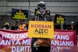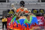 Sejumlah aktivis yang tergabung dalam Jejaring Organisasi Masyarakat Sipil Indonesia melakukan aksi di depan Kantor Kedutaan Besar Jepang, Jakarta, Senin (27/10/2025). Aksi tersebut bertujuan untuk mendesak pemerintah Jepang dan Indonesia agar berkomitmen pada transisi energi yang cepat, adil, dan merata. ANTARA FOTO/Rivan Awal Lingga/rwa.