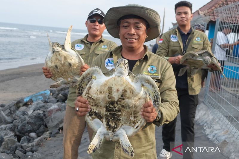 Petugas membawa penyu untuk dilepasliarkan di Pantai Saba, Gianyar, Bali, Senin (27/10/2025). Kementerian Kehutanan bersama Komisi IV DPR RI melepasliarkan delapan ekor penyu jenis Penyu sisik (Eretmochelys imbricata), Penyu hijau (Chelonia mydas), dan Penyu lekang (Lepidochelys olivacea) serta 200 ekor tukik ke habitatnya untuk melestarikan populasi penyu dan menjaga keseimbangan ekosistem laut. ANTARA FOTO/Nyoman Hendra Wibowo/agr