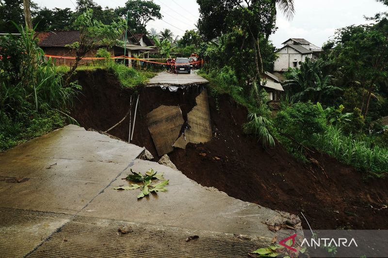 Sebuah mobil berhenti di salah satu ujung jalan yang amblas terseret longsor di Desa Nyawangan, Tulungagung, Jawa Timur, Senin (3/11/2025). Jalan antardesa di lereng Gunung Wilis itu amblas terseret longsor dengan kedalaman 20 meter dan menyebabkan akses roda dua, roda empat maupun lebih, terganggu. ANTARA FOTO/Destyan Sujarwoko/agr
