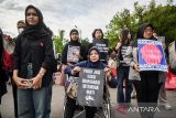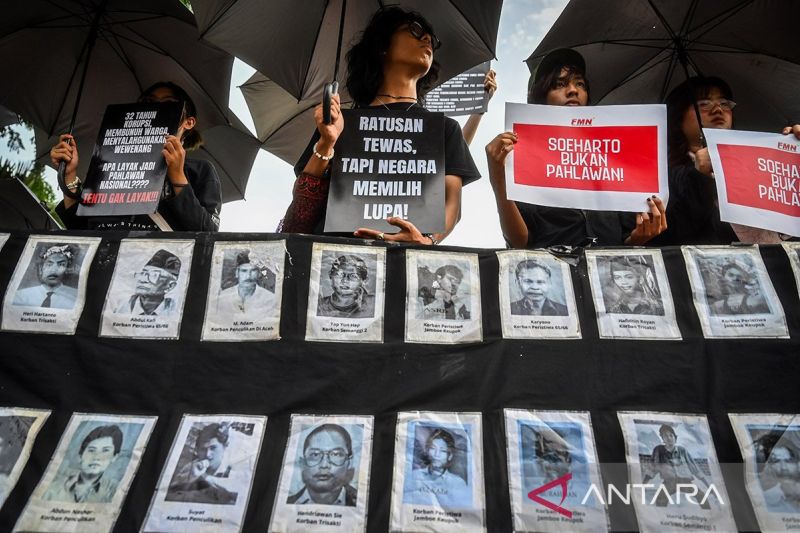 Aktivis Jaringan Solidaritas Korban untuk Keadilan mengikuti Aksi Kamisan ke-885 di depan Istana Merdeka, Jakarta, Kamis (6/11/2025). Aksi tersebut bertujuan untuk menuntut pemerintah agar tidak memberikan gelar pahlawan nasional kepada Presiden ke-2 RI Soeharto. ANTARA FOTO/Rivan Awal Lingga/rwa.