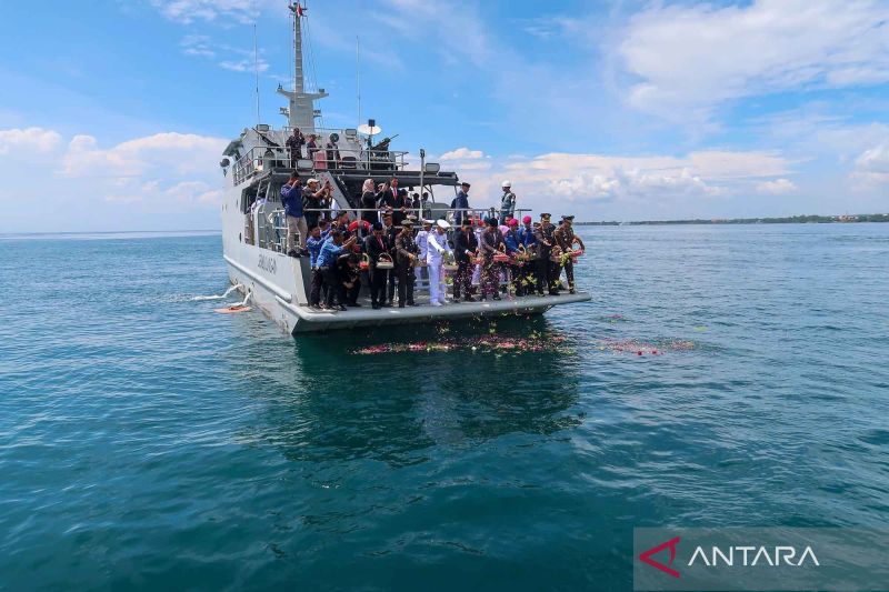 Prajurit TNI AL bersama Forkopimda Banyuwangi melaksanakan tabur bunga dari atas KAL Sembulungan 11-5-42 di Selat Bali, Banyuwangi, Jawa Timur, Senin (10/11/2025). Memperingati Hari Pahlawan 2025, TNI AL bersama Forkopimda setempat melaksanakan tabur bunga di laut untuk mengenang jasa para pahlawan yang telah gugur. ANTARA FOTO/Budi Candra Setya/nym.