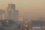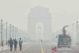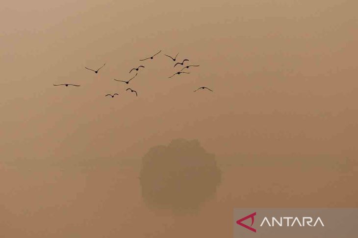 Sekawanan burung terbang melewati pohon saat pagi hari di tengah polusi udara di New Delhi, India, Senin (10/11/2025). ANTARA FOTO/REUTERS/Adnan Abidi/rwa.