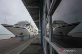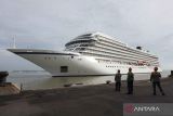Kapal pesiar MS Viking Orion bersandar di Dermaga Jamrud Utara, Pelabuhan Tanjung Perak, Surabaya, Jawa Timur, Jumat (14/11/2025). Kapal pesiar berbendera Norwegia itu membawa sebanyak 877 penumpang dari berbagai negara dan kru ABK sebanyak 470 orang yang akan berkunjung ke sejumlah tempat wisata di Surabaya. ANTARA FOTO/Didik Suhartono/YU