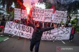 Suporter Timnas Indonesia yang tergabung dalam Ultras Garuda melakukan aksi tuntut revolusi total PSSI di Jalan Gerbang Pemuda, Jakarta, Jumat (14/11/2025). Aksi tersebut sebagai bentuk kekecewaan suporter atas kegagalan Timnas Indonesia menembus ajang Piala Dunia 2026 sekaligus meminta kepada PSSI agar proses rekrutmen pelatih menjadi lebih transparan dan profesional serta pembinaan atlet usia dini yang konsisten dan terintegrasi. ANTARA FOTO/Fauzan/nym.