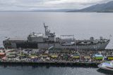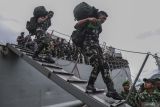Dua prajurit TNI AD memanggul barang bawaannya turun dari KRI Teluk Ende-517 tiba di Pelabuhan Ahmad Yani Ternate, Maluku Utara, Sabtu (22/11/2025). Korem 152/Babullah Ternate menerima sebanyak 466 prajurit TNI AD asal Malut yang telah selesai mengikuti pendidikan Bintara dan Tamtama selama tiga bulan di Rindam XV/Pattimura Ambon untuk ditempatkan di kesatuannya masing-masing di Maluku Utara dan membantu pemerintah daerah dalam pembangunan. ANTARA FOTO/Andri Saputra/foc.