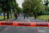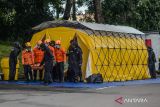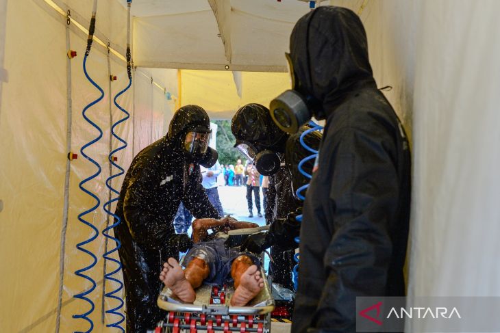 Simulasi bencana kegagalan teknologi industri. Petugas Kimia, Biologi, dan Radioaktif (KBR) Gegana Brimob Polda Banten melakukan dekontaminasi kepada warga yang terpapar bahan kimia industri saat simulasi di Kawasan Industri Krakatau, Kota Cilegon, Banten, Rabu (26/11/2025). Simulasi gabungan BPBD, Basarnas, Damkar, PMI, TNI, dan Polri tersebut digelar dengan tujuan untuk melatih kemampuan petugas serta penanganan pertama korban dalam menanggapi bencana kegagalan teknologi industri seperti kebakaran pabrik, serta ledakan ruang reaktor. ANTARA FOTO/Muhammad Bagus Khoirunas/sgd