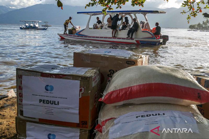 Relawan menaiki kapal saat mengangkut bantuan logistik untuk disalurkan ke daerah terisolir akibat banjir bandang dan tanah longsor di Batu Taba, Kabupaten Tanah Datar, Sumatera Barat, Senin (1/12/2025). Pengiriman bantuan logistik melalui Danau Singkarak menjadi satu-satunya akses transportasi menuju Nagari Malalo, Batipuh Selatan, Tanah Datar, dikarenakan akses jalan menuju daerah tersebut terputus akibat banjir bandang dan tanah longsor di daerah itu. ANTARA FOTO/Wawan Kurniawan/nym.