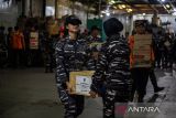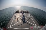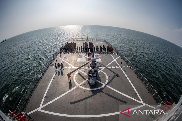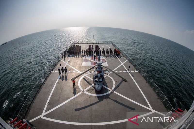 Prajurit TNI AL mengikuti Apel kesiapan Satgas Penanggulangan Bencana TNI AL di KRI dr Soeharso-990, Selat Malaka, Riau, Rabu (3/12/2025). Apel tersebut untuk memastikan kesiapan anggota, peralatan, perlengkapan hingga bantuan yang akan digunakan serta didistribusikan ke wilayah terdampak bencana di Sumatera. ANTARA FOTO/Bayu Pratama S/rwa.