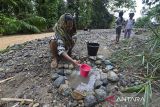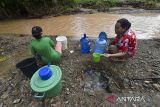 Penyintas banjir mengambil air untuk keperluan mandi, cuci, dan kakus (MCK) dari lubang yang digali di samping alur air Sungai Lareh yang keruh akibat banjir di Koto Tangah, Padang, Sumatera Barat, Jumat (12/12/2025). Warga setempat menyebutkan, sebanyak 50 kepala keluarga (KK) penyintas banjir di sepanjang alur Sungai Lareh setempat mulai kesulitan mendapatkan air bersih karena rusaknya air Sungai Lareh yang terdampak banjir sejak Kamis (27/11) dan berharap adanya bantuan air bersih dari pihak terkait. ANTARA FOTO/Wahdi Septiawan/rwa.