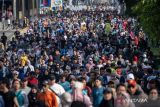 Warga berolahraga saat Hari Bebas Kendaraan Bermotor (HBKB) di Jalan Jenderal Sudirman, Jakarta, Minggu (4/1/2026). HBKB atau Car Free Day (CFD) perdana pada 2026 tersebut dimanfaatkan masyarakat untuk berolahraga dan berekreasi sekaligus mendukung upaya pengurangan polusi udara di Jakarta. ANTARA FOTO/Bayu Pratama S/YU