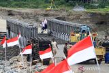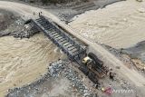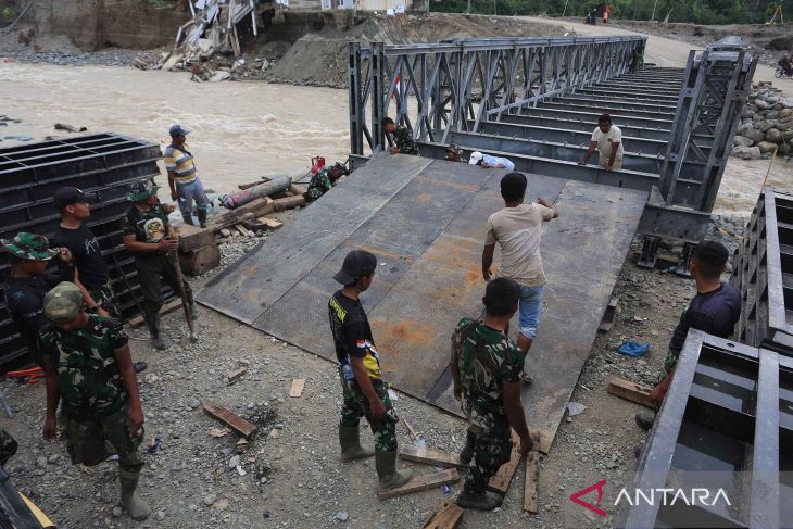 Sejumlah pekerja dan prajurit TNI AD menyelesaikan pembangunan jembatan bailey penghubung Kabupaten Aceh Tengah dan Kabupaten Nagan Raya di Desa Blang Beurandeh, Kecamatan Beutong Ateuh Banggalang, Nagan Raya, Aceh, Senin (5/1/2026). Kementerian Pekerjaan Umum bersama TNI AD terus berupaya mempercepat penyelesaian pembangunan jembatan bailey yang menghubungkan Kabupaten Aceh Tengah dan Kabupaten Nagan Raya untuk memperlancar akses transportasi dan memulihkan daerah terdampak yang diharapkan dapat selesai pada pertengahan Januari 2026. ANTARA FOTO/Syifa Yulinnas/nym.