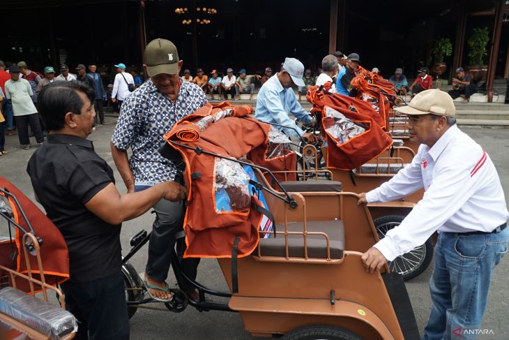 Petugas memandu pengemudi becak lansia yang berlatih mengendarai becak listrik bantuan Presiden Prabowo Subianto di halaman Pendopo Kabupaten Tulungagung, Tulungagung, Jawa Timur, Kamis (8/1/2026). Sebanyak 200 pengemudi becak berusia 60 tahun ke atas mengikuti pelatihan tersebut sebelum menerima unit kendaraan roda tiga bantuan Presiden melalui Yayasan Gerakan Solidaritas Nasional sebagai upaya meningkatkan kesejahteraan dan produktivitas kerja pengemudi becak di tengah tantangan ekonomi. ANTARA FOTO/Destyan Sujarwoko/nym.