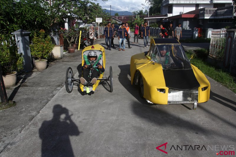 Pengemudi menguji coba mobil kreasi mahasiswa Fakultas Teknik Universitas Negeri Padang, jelang kontes mobil hemat energi di Padang, Sumatera Barat, Jumat (23/11/2018). Kontes mobil hemat energi (KMHE) 2018 akan diselenggarakan pada tanggal 27 November hingga 2 Desember di Universitas Negeri Padang, yang diikuti oleh 74 tim dari perguruan tinggi seluruh Indonesia. ANTARA FOTO/Muhammad Arif Pribadi/wsj.