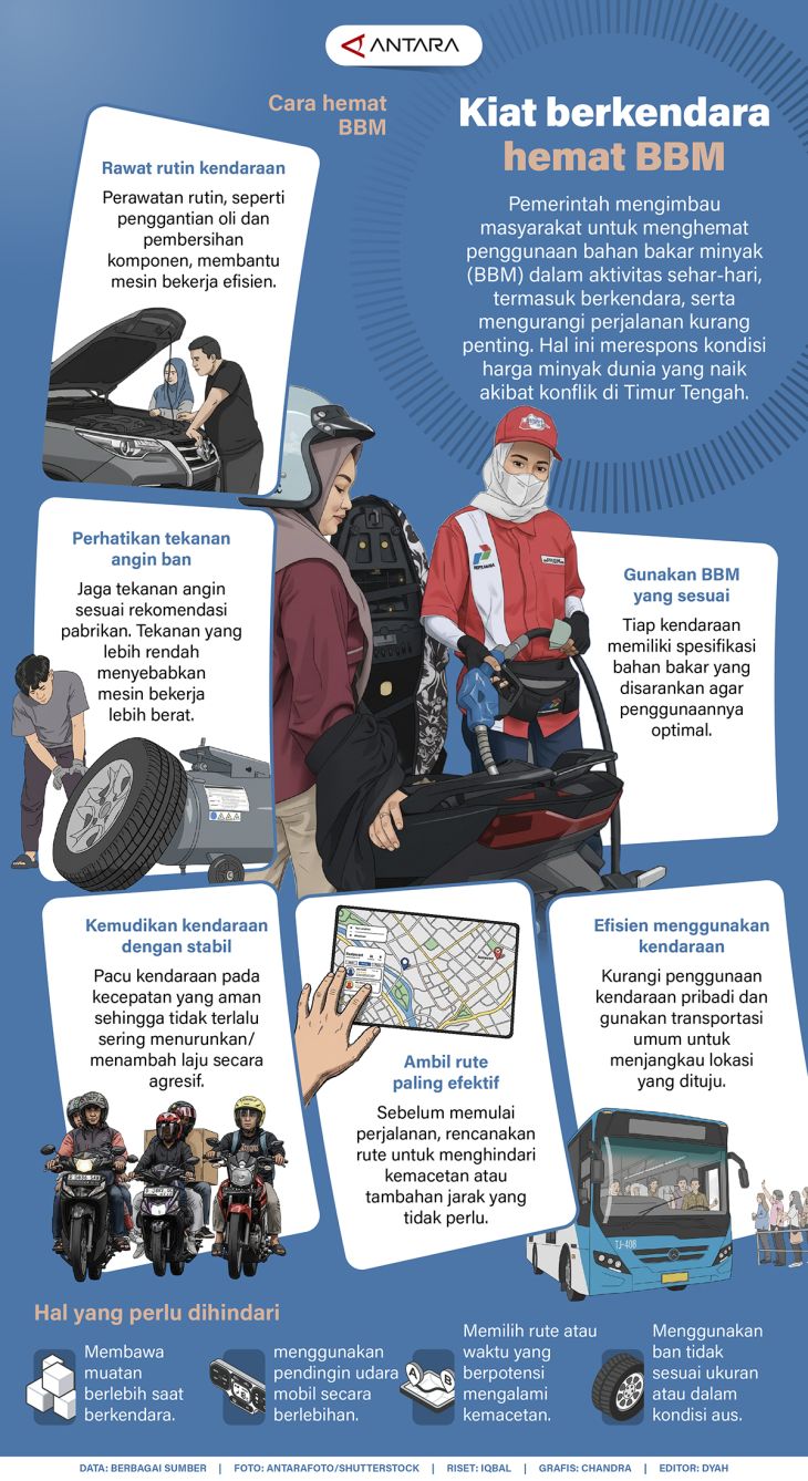 Pemerintah mengimbau masyarakat untuk menghemat penggunaan bahan bakar minyak (BBM) dalam aktivitas sehar-hari, termasuk berkendara, serta mengurangi perjalanan kurang penting. Hal ini merespons kondisi harga minyak dunia yang naik akibat konflik di Timur Tengah.